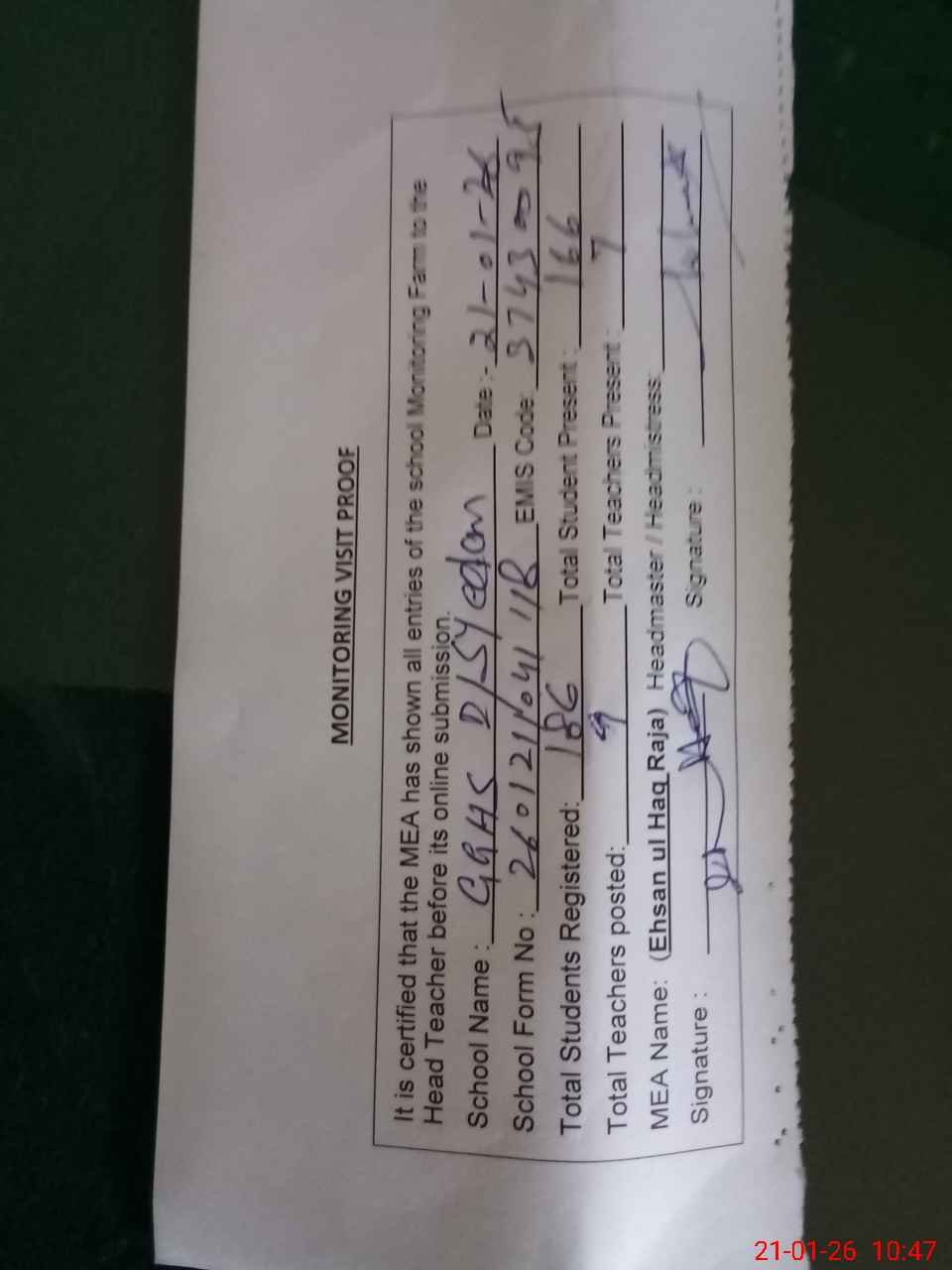 | Attendance Register | Head Teacher | MEA with School | Visit Proof |