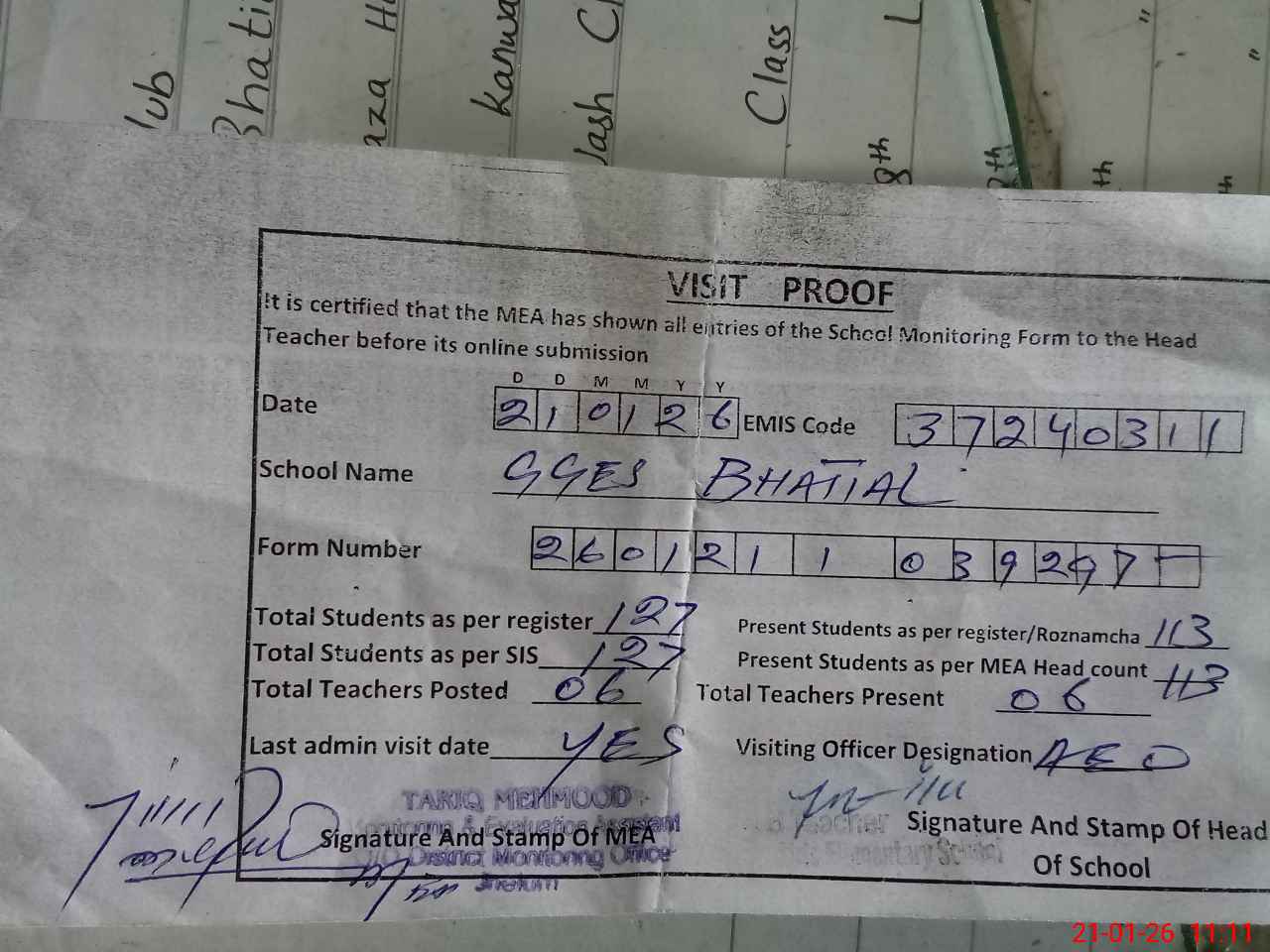 | Attendance Register | Head Teacher | MEA with School | Visit Proof |