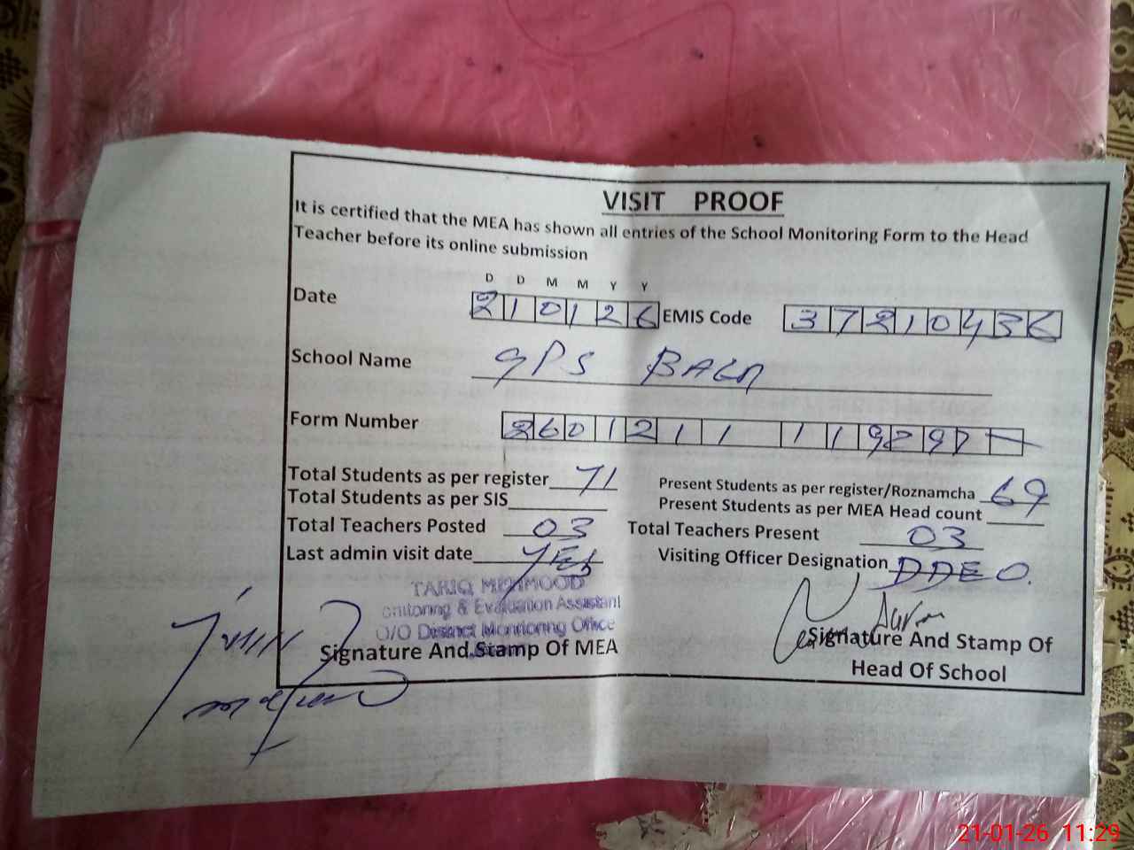 | Attendance Register | Head Teacher | MEA with School | Visit Proof |