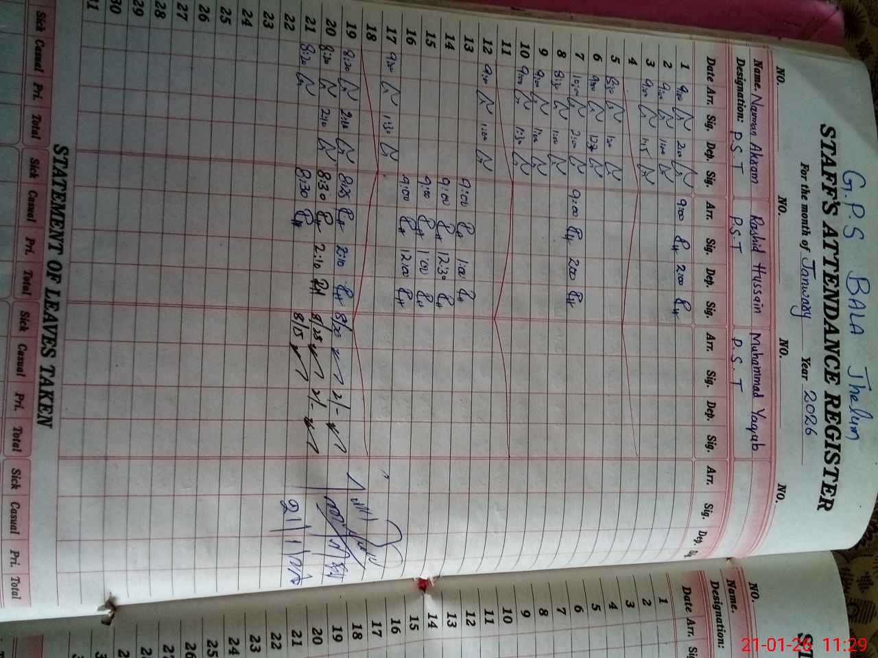 | CNIC | Full Name | Designation | R/C | Absence During Last Calender Month |