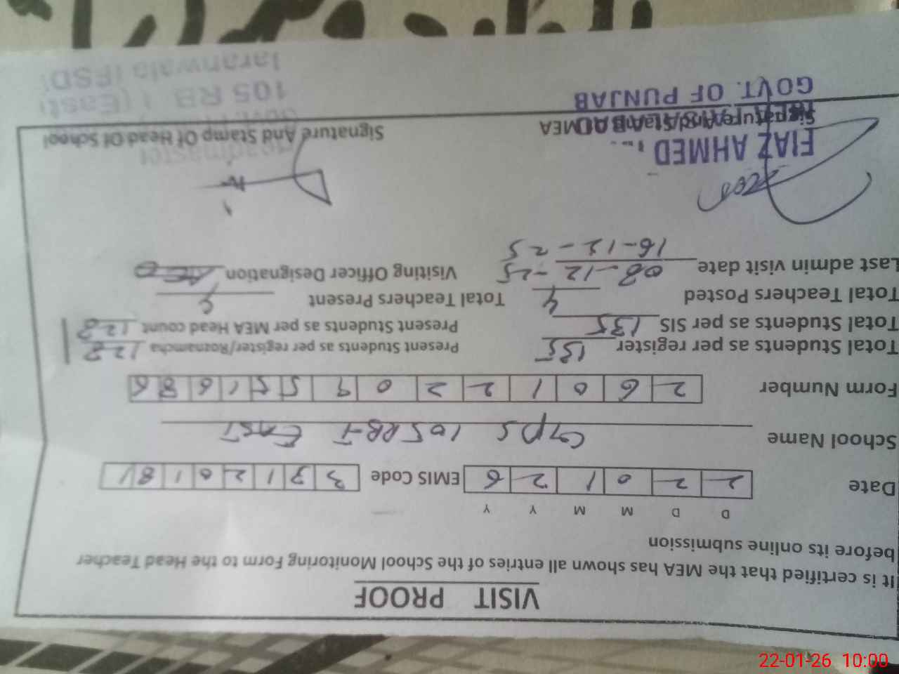 | Certified that this School was Inspected by the Undersigned MEA/DMO Today and the Information Stated Above is as Per Record. | |||||