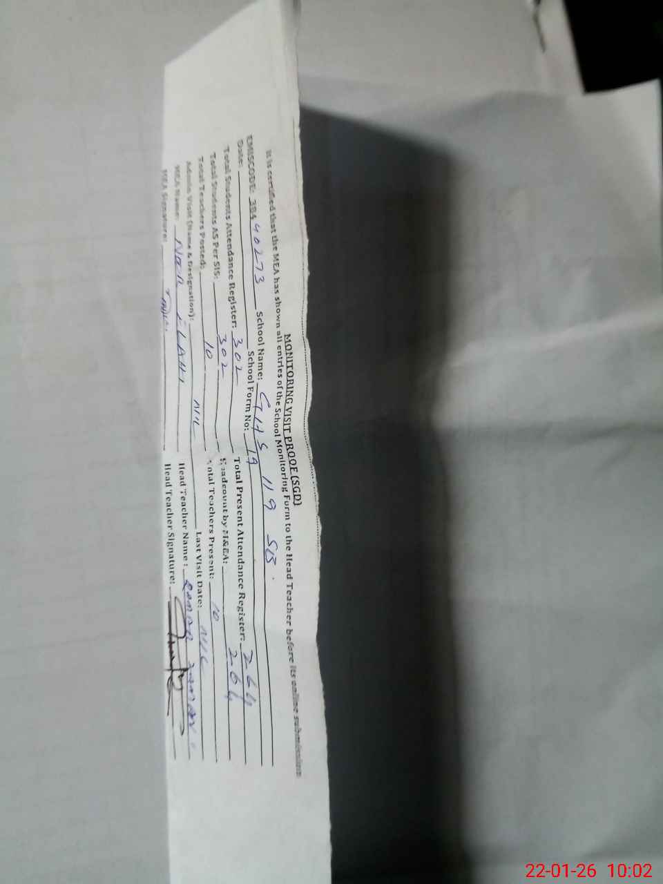 | Attendance Register | Head Teacher | MEA with School | Visit Proof |