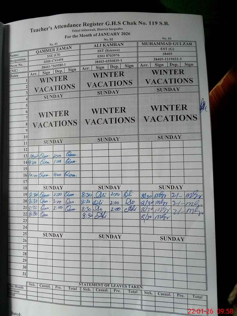 | CNIC | Full Name | Designation | R/C | Absence during last cal. month |