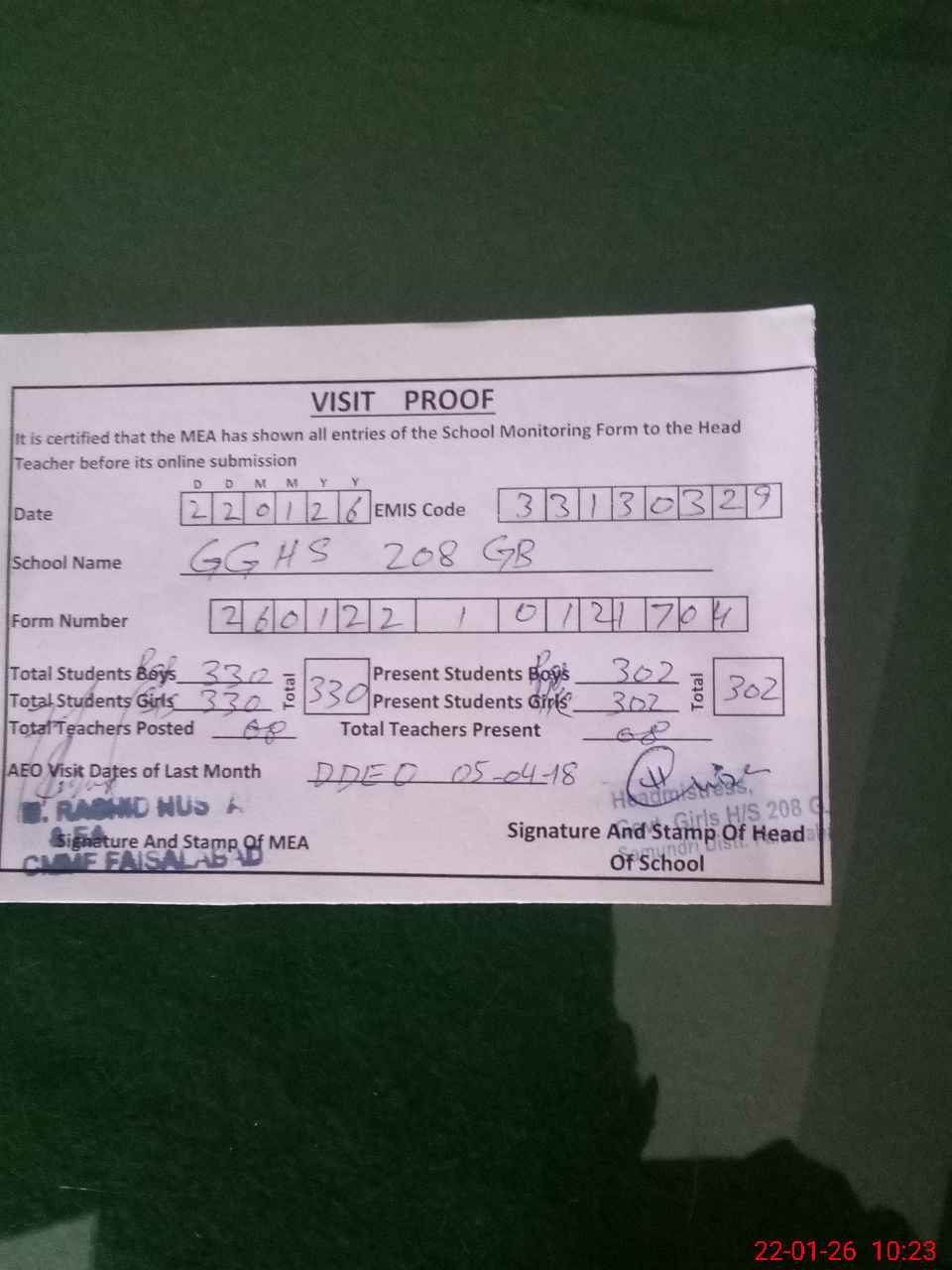| EMIS Code: 33130329 | Name of School: GGHS CHAK NO.208/GB | |||