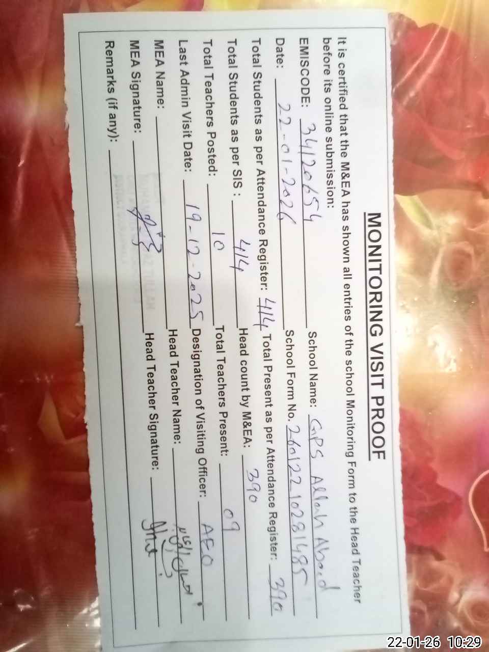 | EMIS Code: 34120654 | Name of School: GPS ALLAH ABAD WAZIRABAD | |||