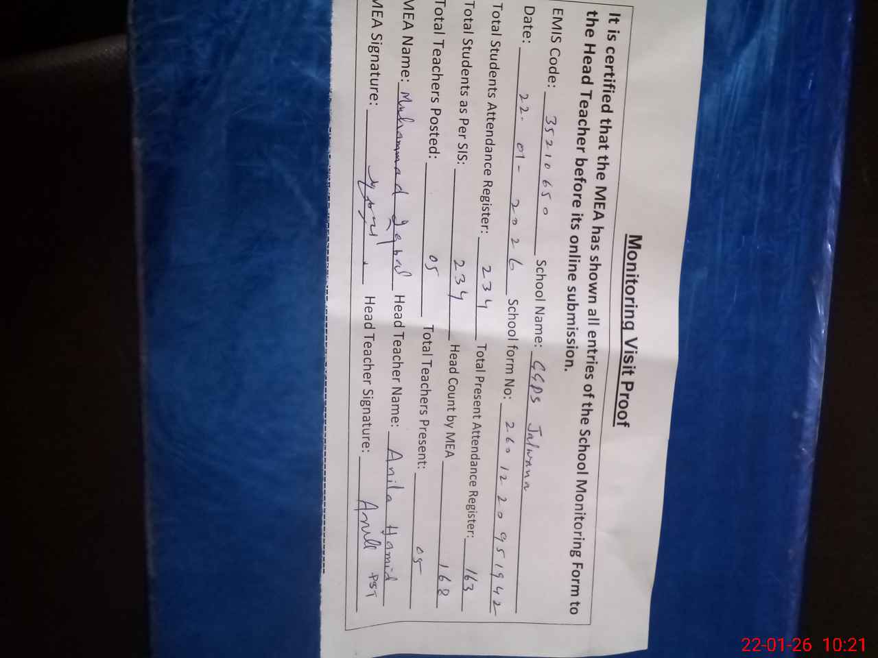 | Name: AN**** HA**** Designation: (School Headmaster's/Headmistress's) PST Phone/Cell Number: 03**** |
