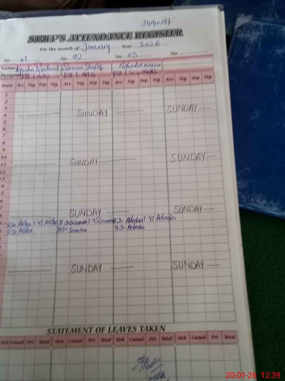 | CNIC | Full Name | Designation | R/C | Absence During Last Calender Month |