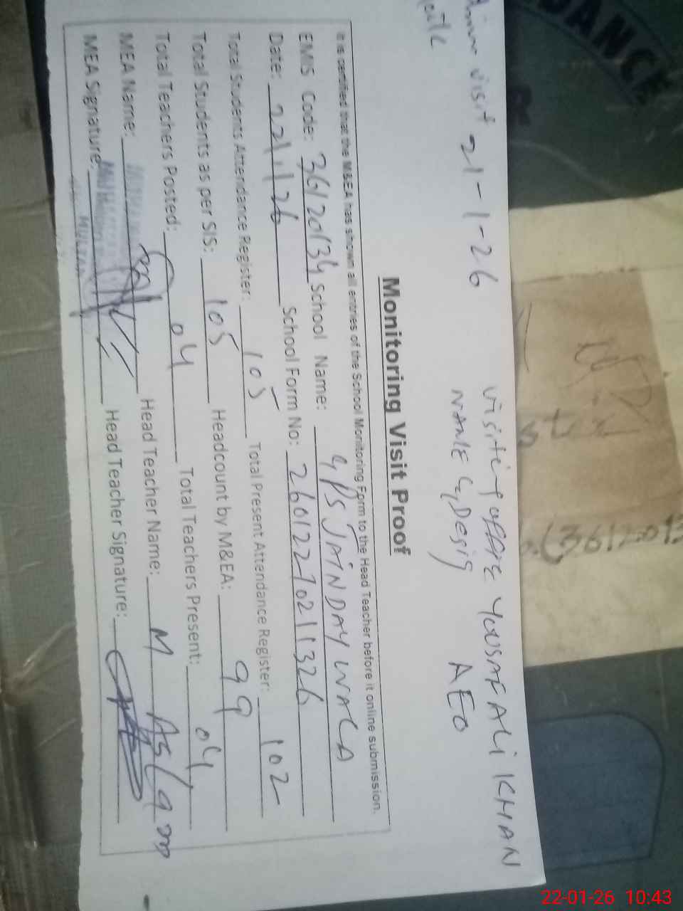 | Attendance Register | Head Teacher | MEA with School | Visit Proof |