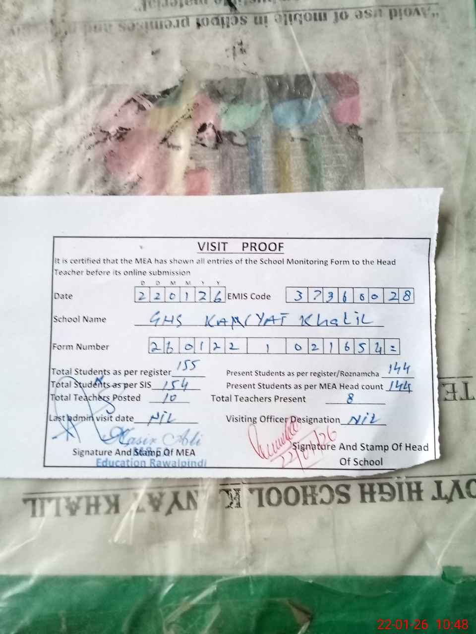 | Attendance Register | Head Teacher | MEA with School | Visit Proof |