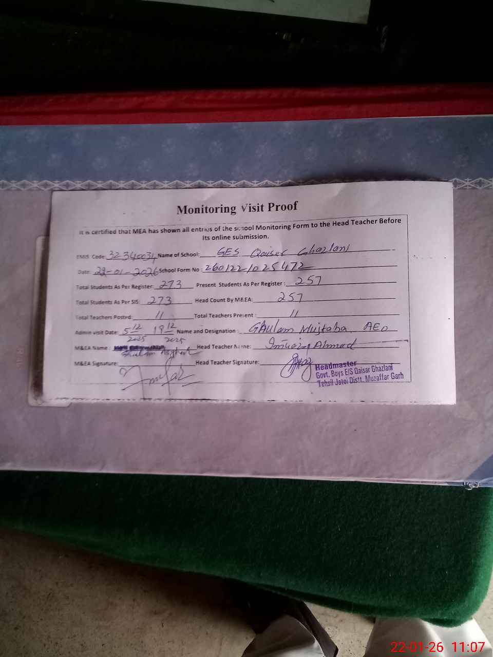 | Attendance Register | Head Teacher | MEA with School | Visit Proof |