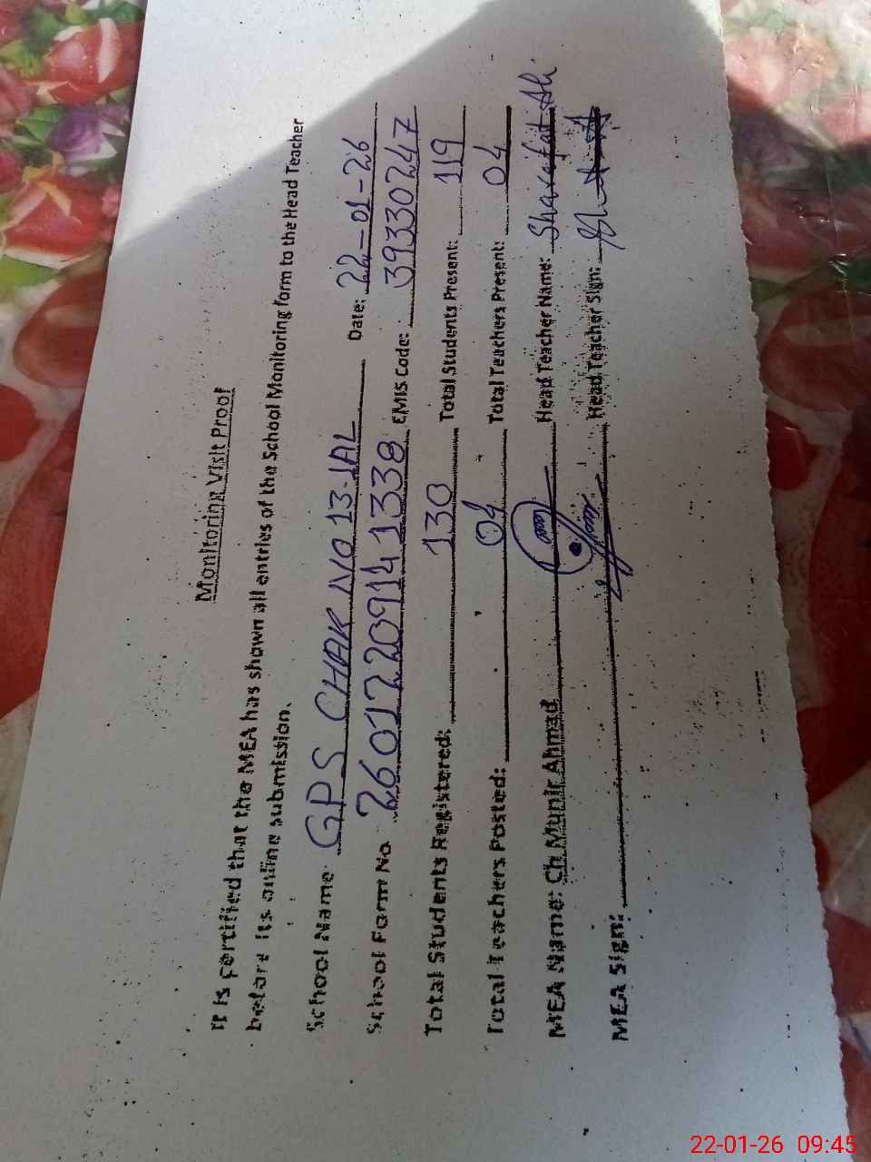 | Attendance Register | Head Teacher | MEA with School | Visit Proof |