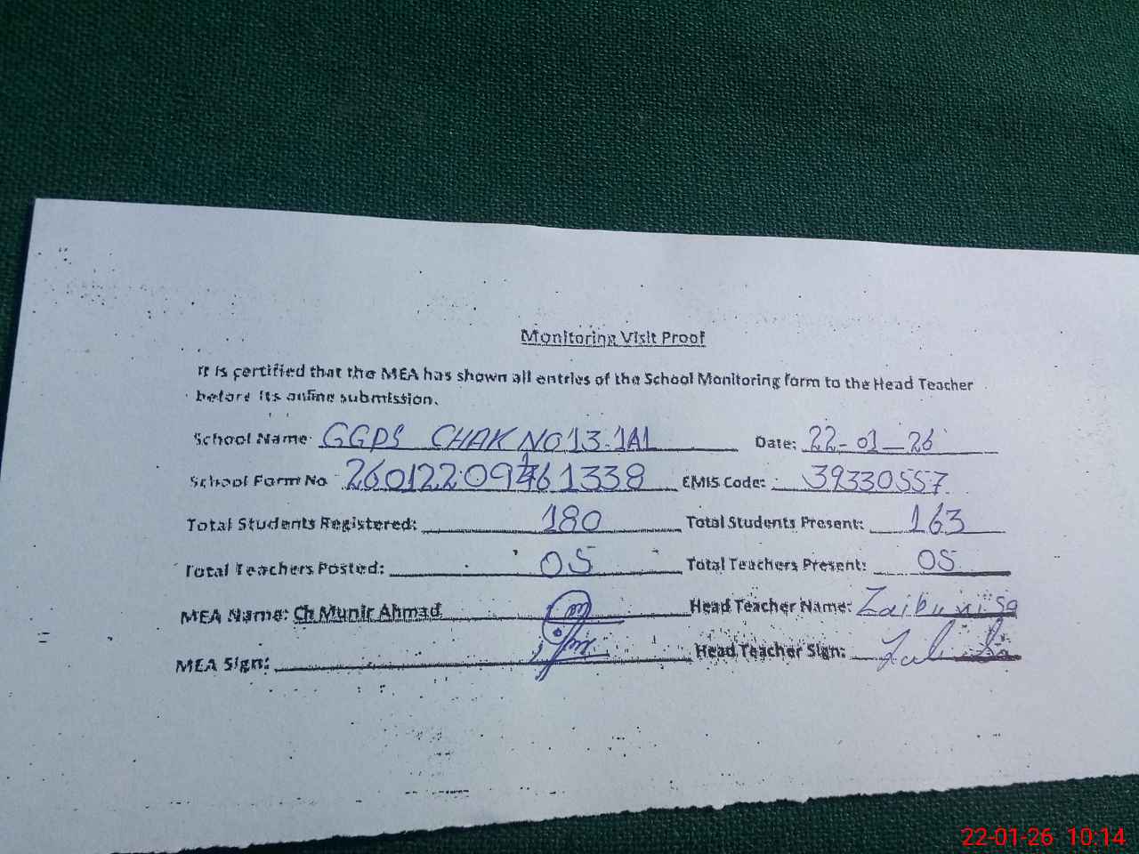 | Attendance Register | Head Teacher | MEA with School | Visit Proof |