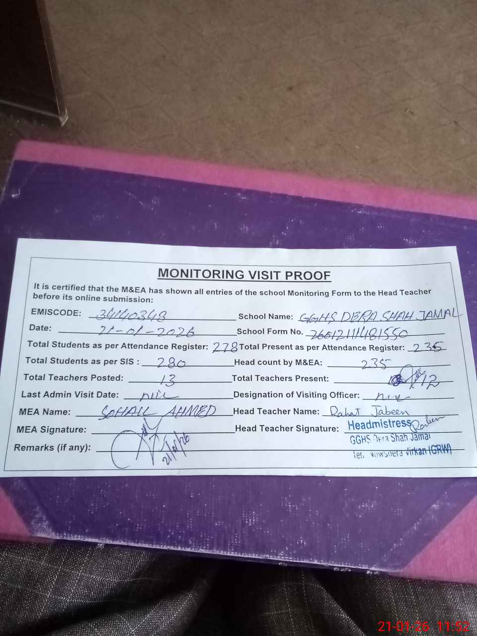 | Attendance Register | Head Teacher | MEA with School | Visit Proof |