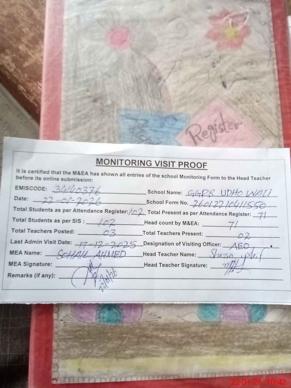 | Attendance Register | Head Teacher | MEA with School | Visit Proof |