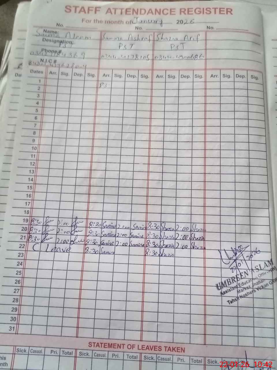 | CNIC | Full Name | Designation | R/C | Absence During Last Calender Month |