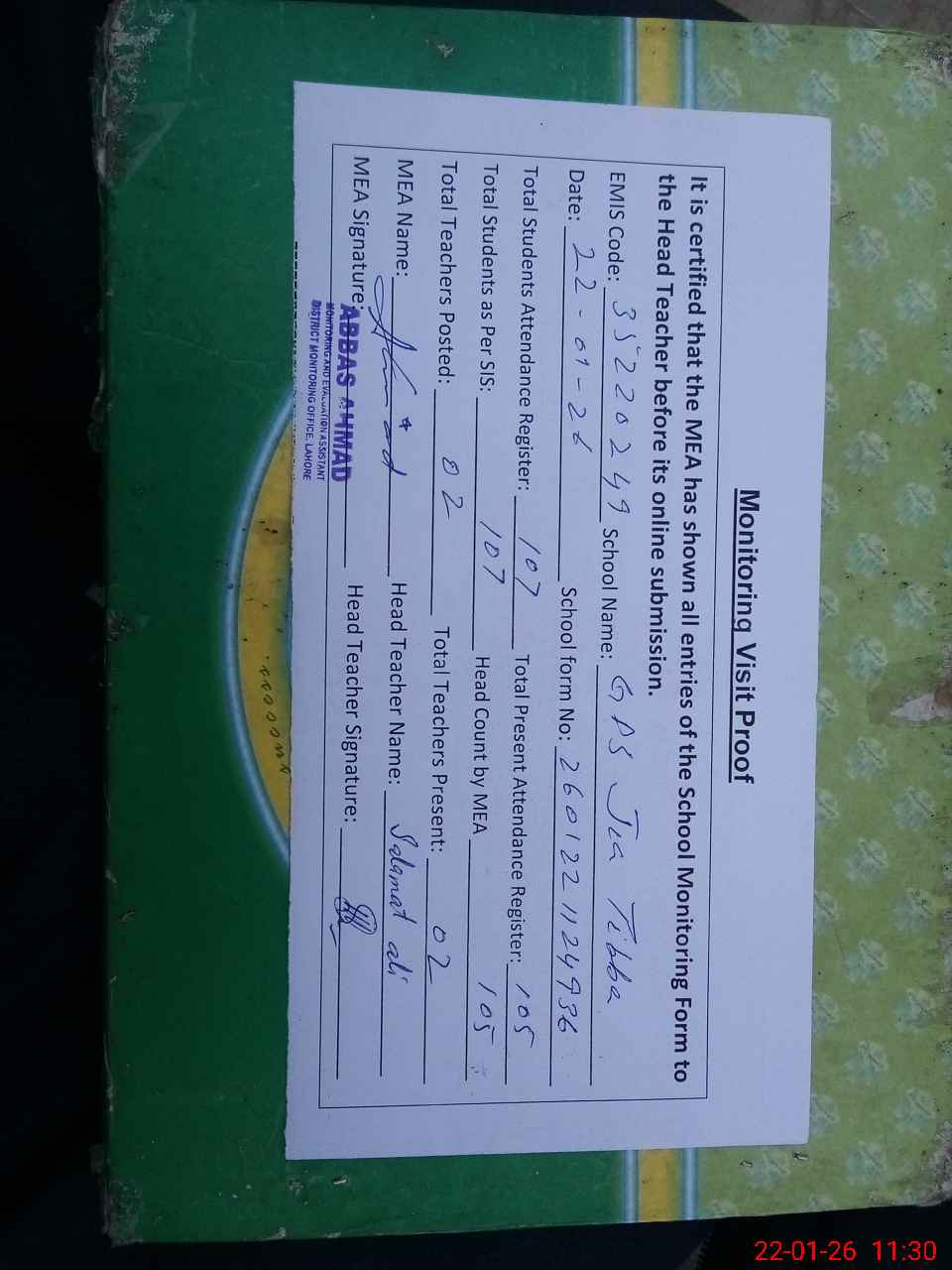 | Attendance Register | Head Teacher | MEA with School | Visit Proof |