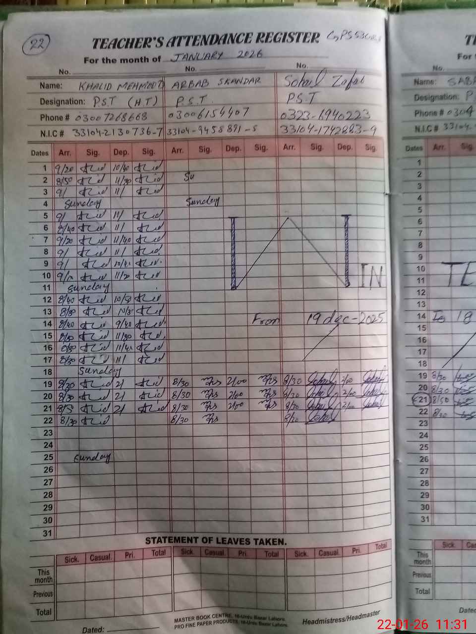 | Name: KH**** MA**** Designation: (School Headmaster's/Headmistress's) PST Phone/Cell Number: 03**** |