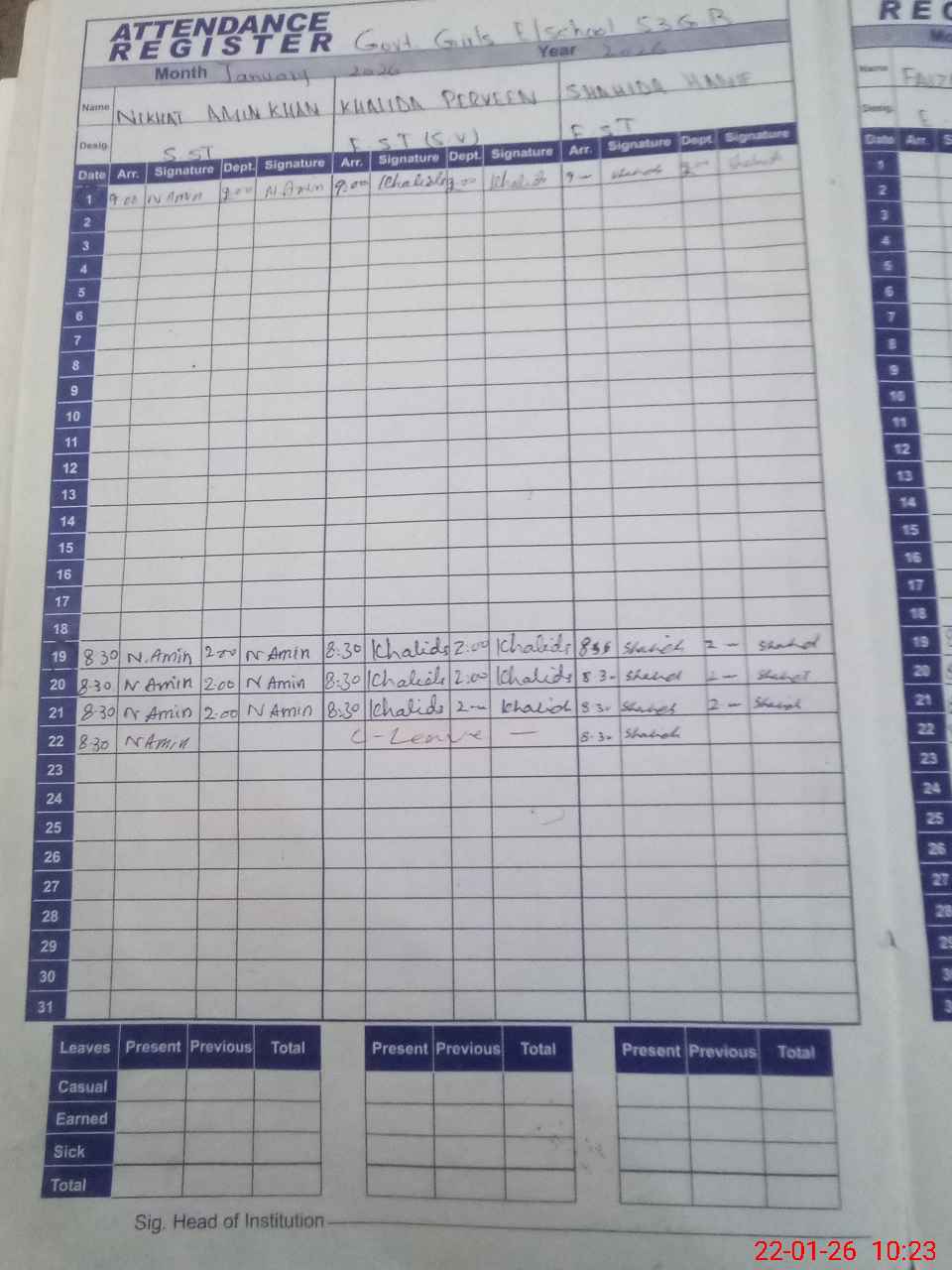 | CNIC | Full Name | Designation | R/C | Absence During Last Calender Month |