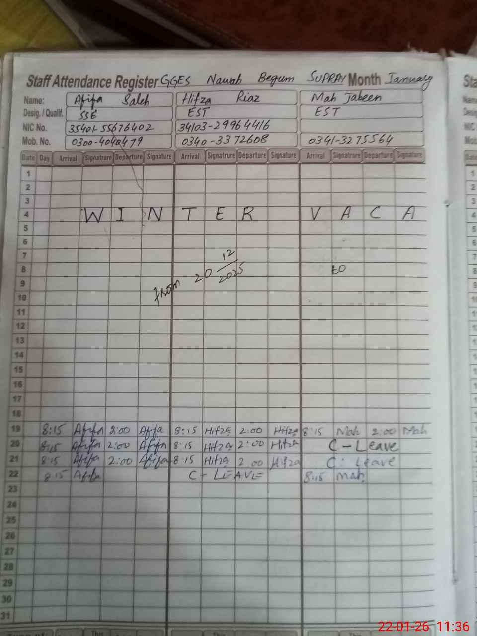 | CNIC | Full Name | Designation | R/C | Absence during last cal. month |