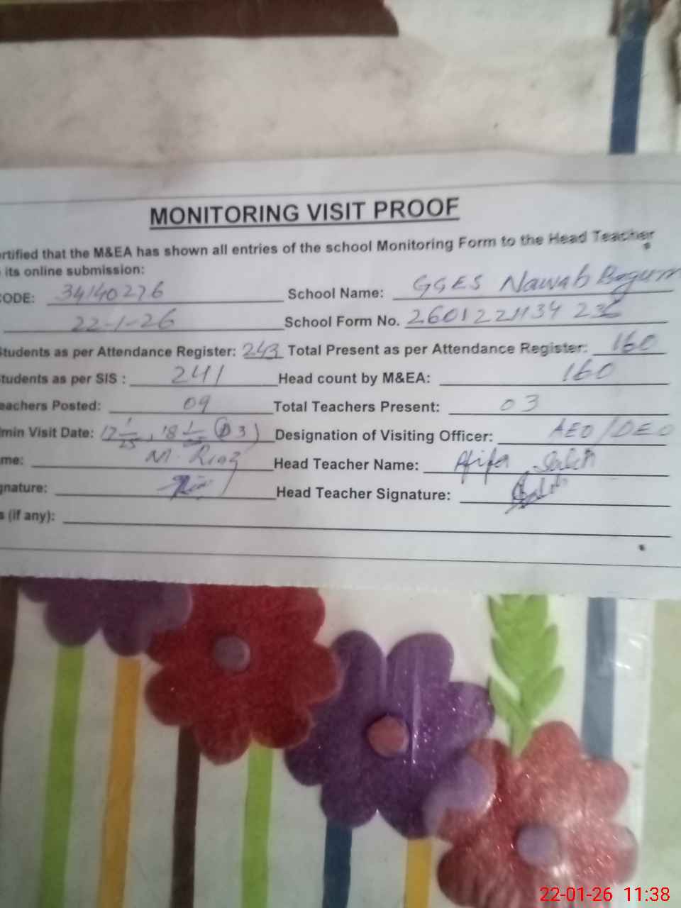 | Attendance Register | Head Teacher | MEA with School | Visit Proof |