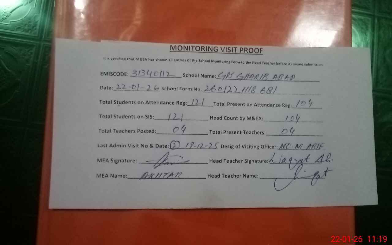 | EMIS Code: 31340112 | Name of School: GPS GHARIB ABAD | |||