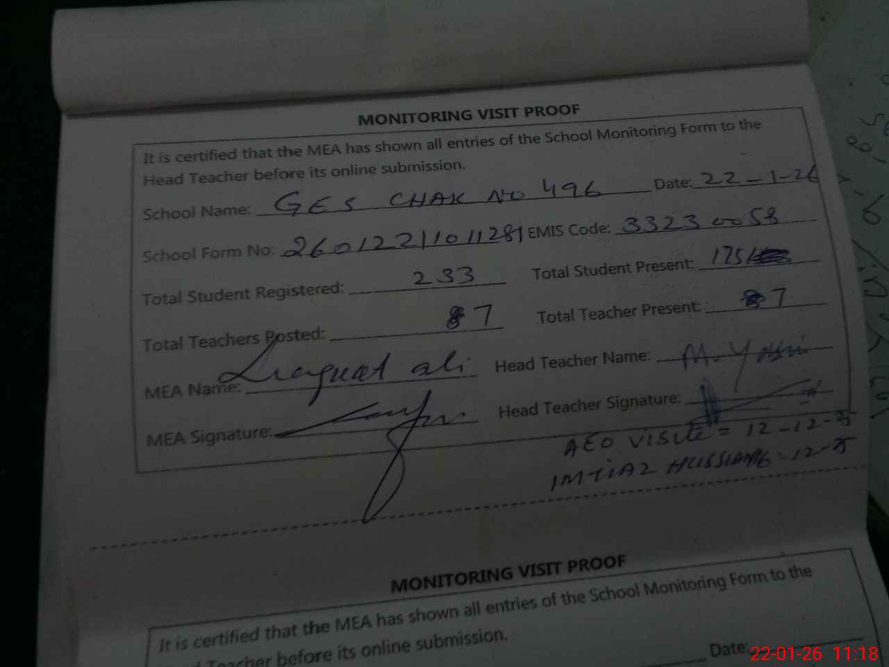 | EMIS Code: 33230058 | Name of School: GES CHAK NO 496 JB | |||