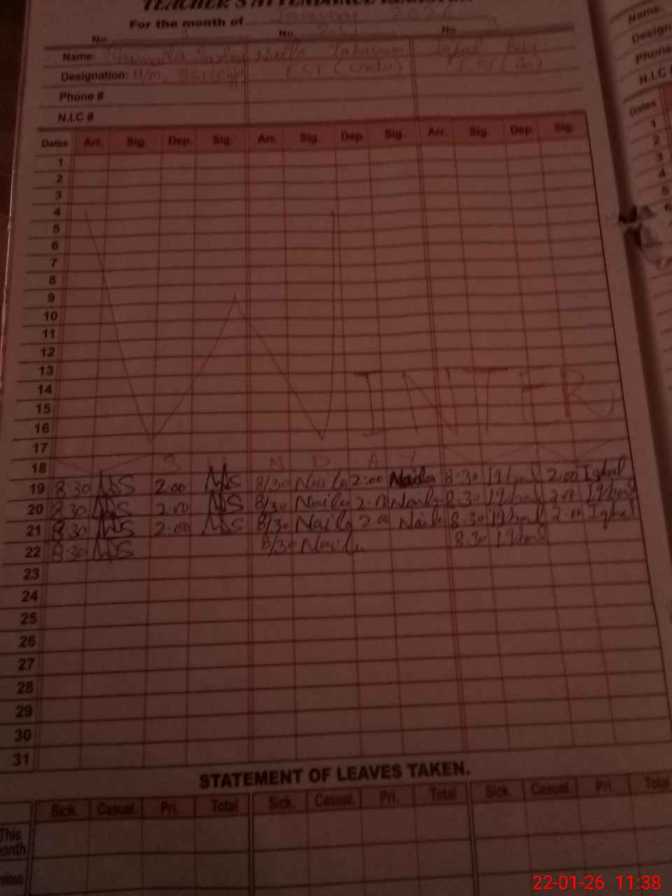 | CNIC | Full Name | Designation | R/C | Absence During Last Calender Month |