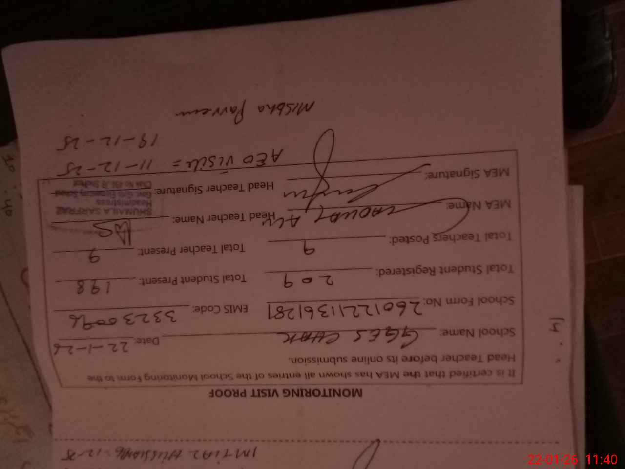 | Attendance Register | Head Teacher | MEA with School | Visit Proof |