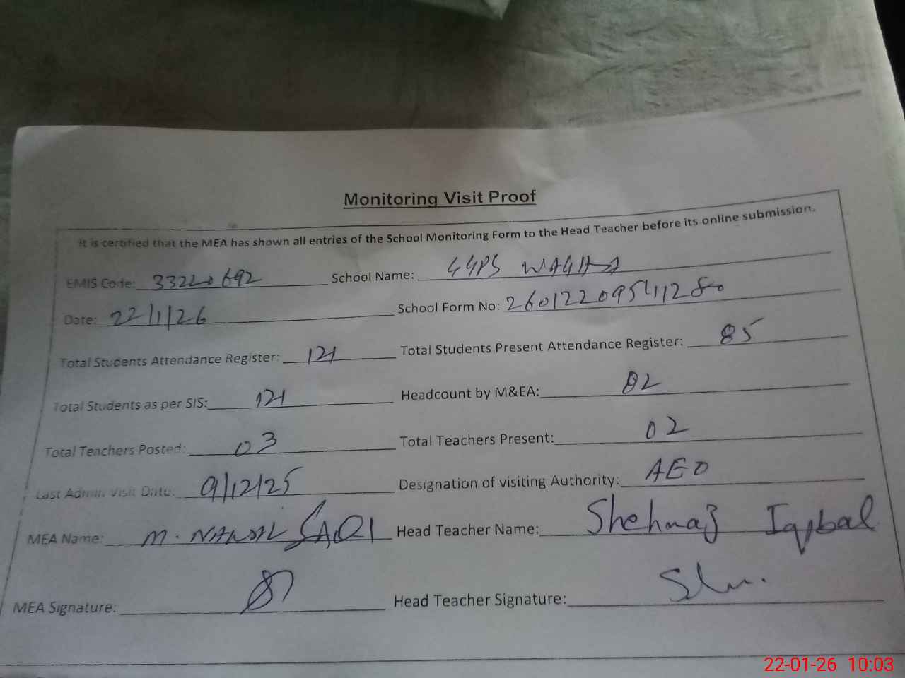 | Attendance Register | Head Teacher | MEA with School | Visit Proof |