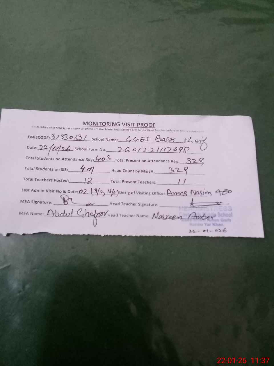 | Attendance Register | Head Teacher | MEA with School | Visit Proof |