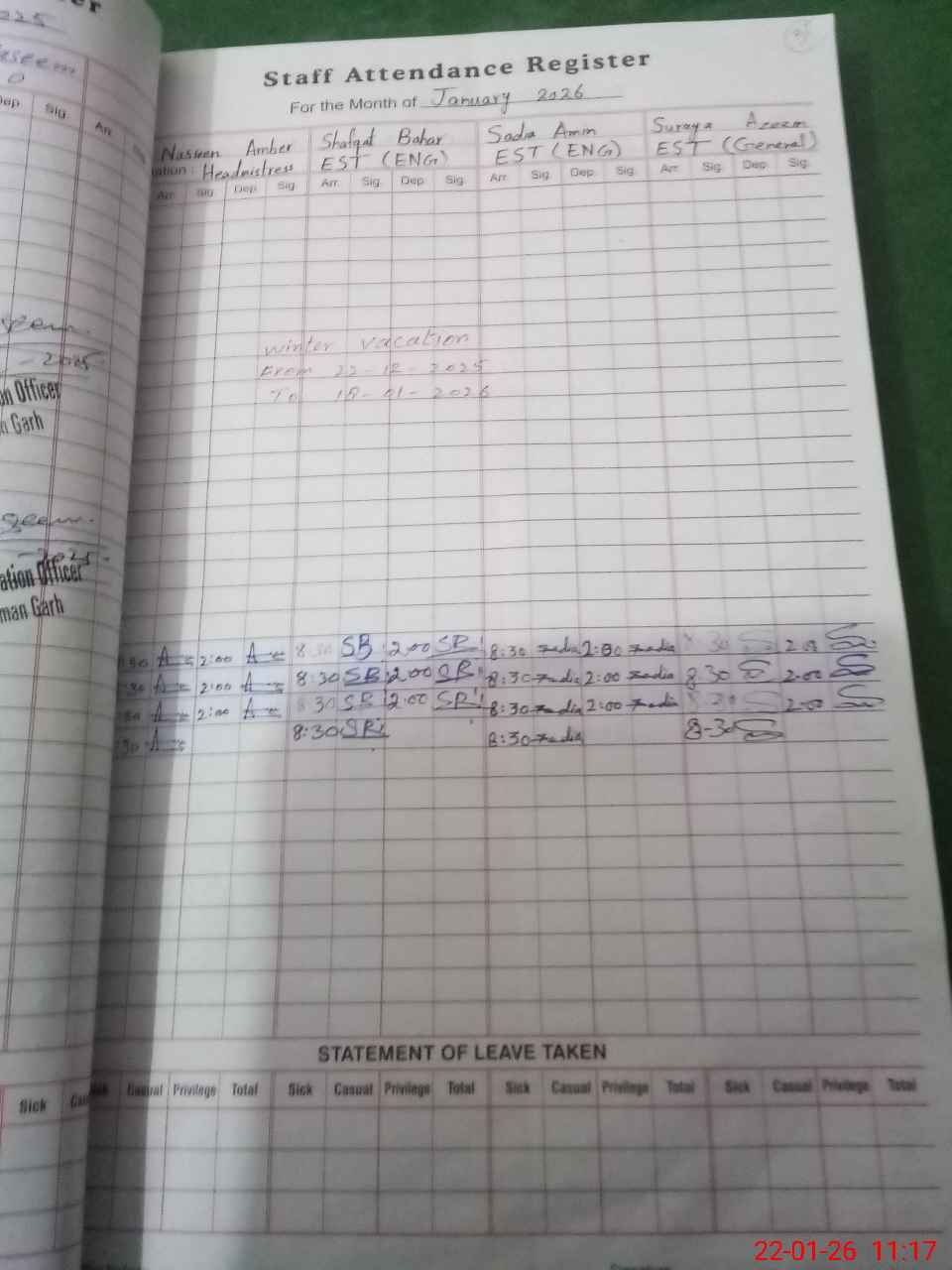 | Leave | Duty | Absent | Maternity | Medical | Ex- Pak |