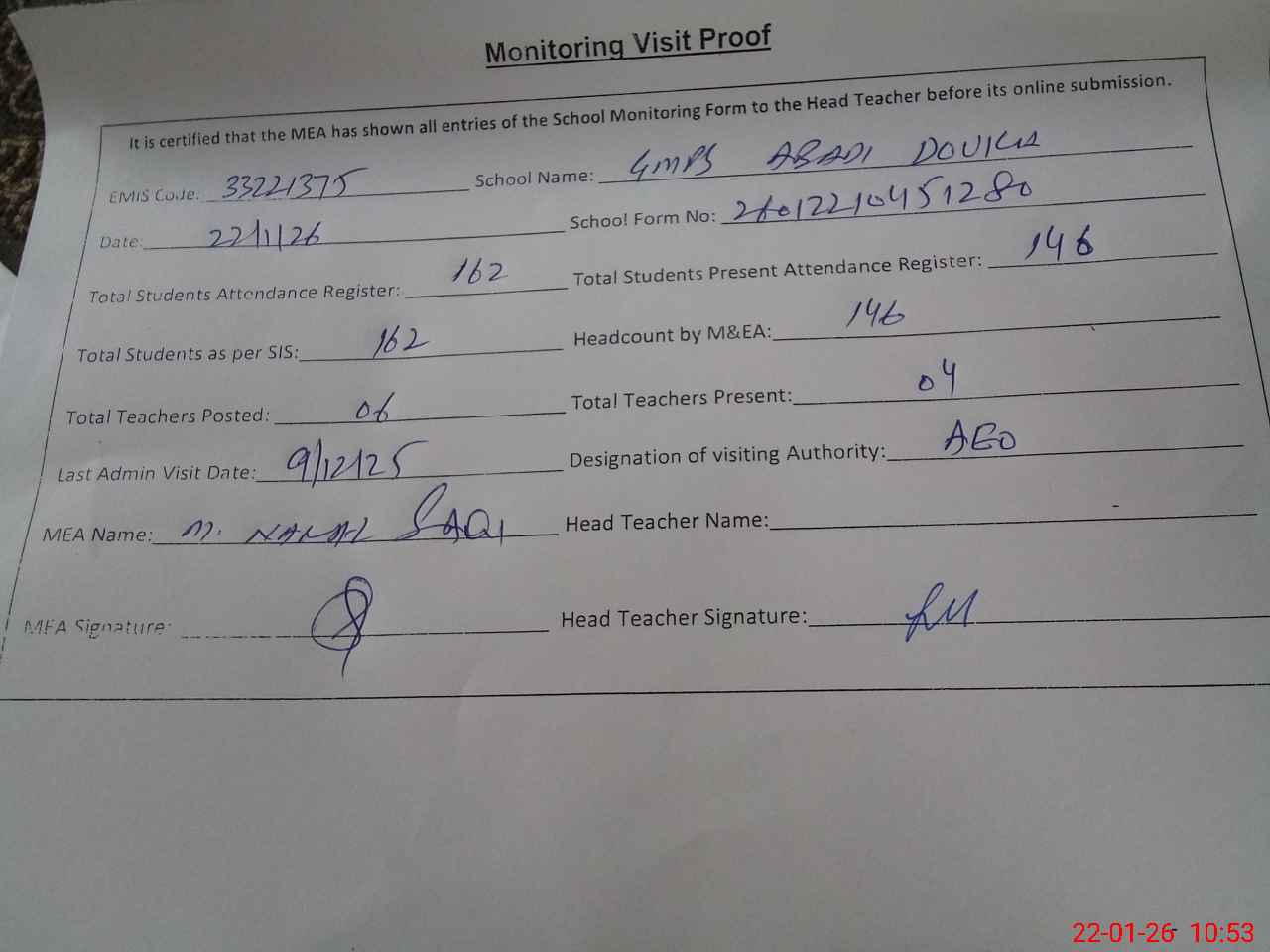 | Attendance Register | Head Teacher | MEA with School | Visit Proof |