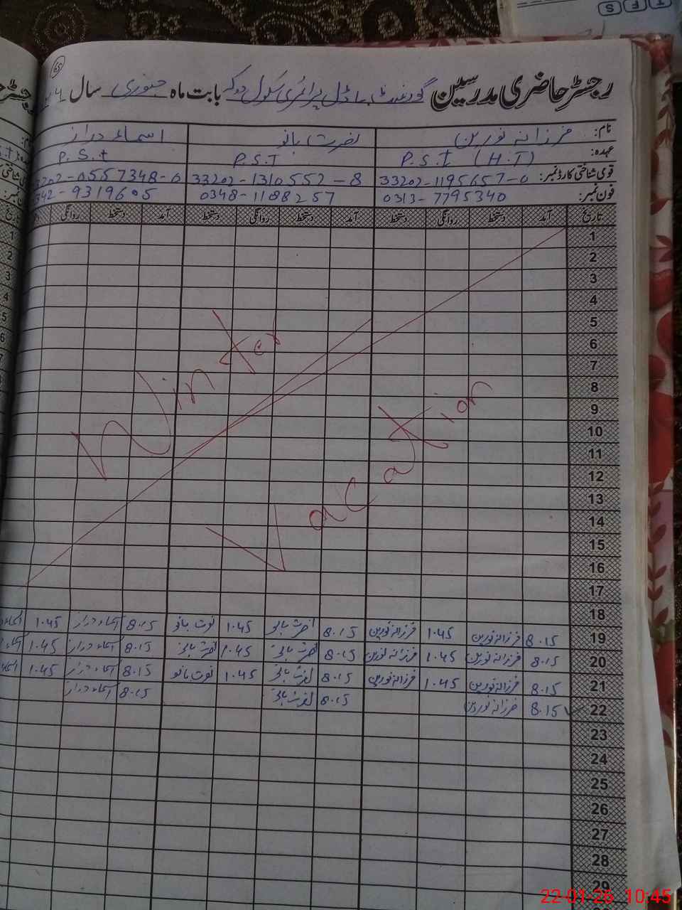 | Name: Sh**** Pa**** Designation: (School Headmaster's/Headmistress's) PST Phone/Cell Number: 03**** |