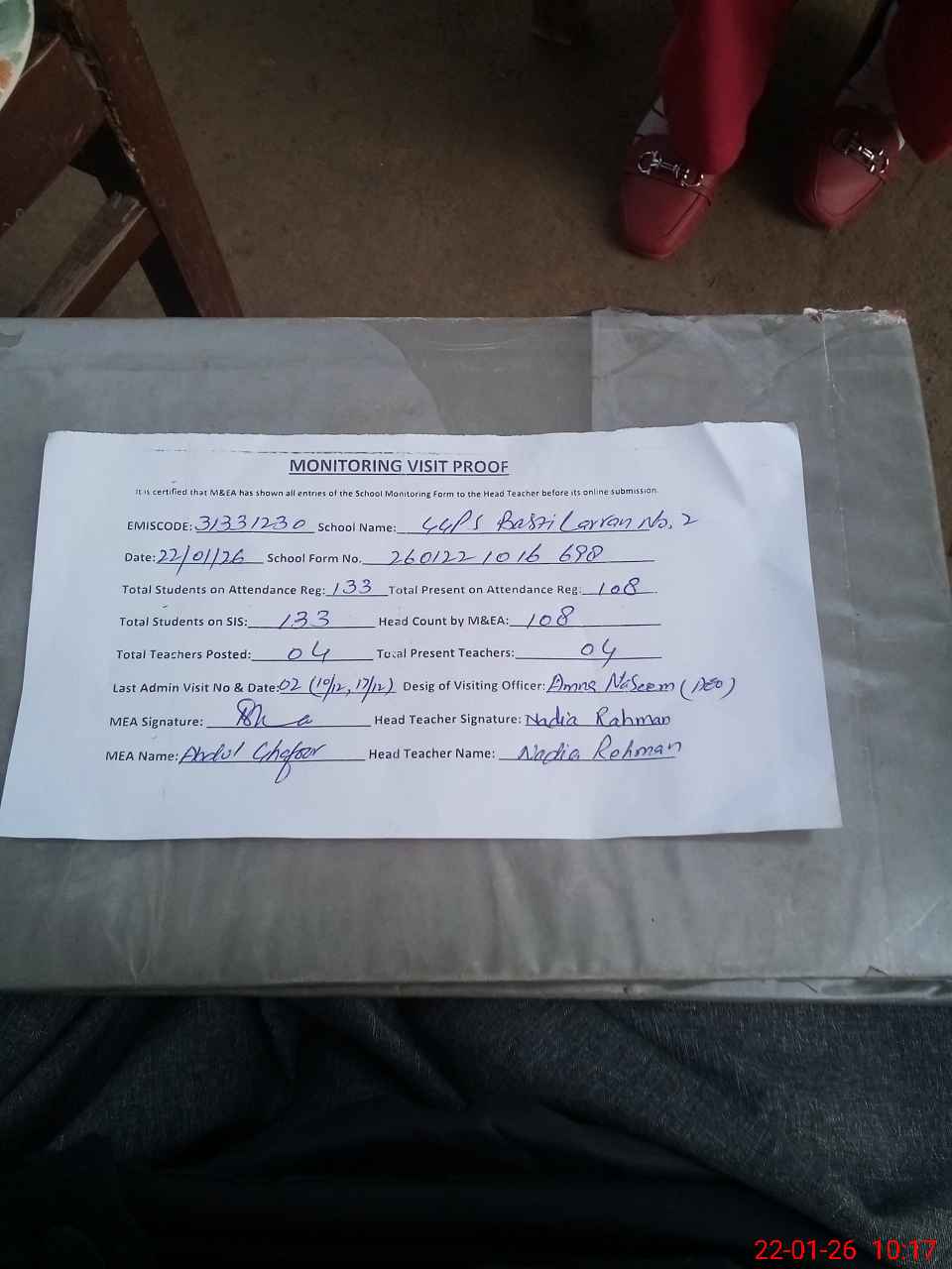 | Attendance Register | Head Teacher | MEA with School | Visit Proof |