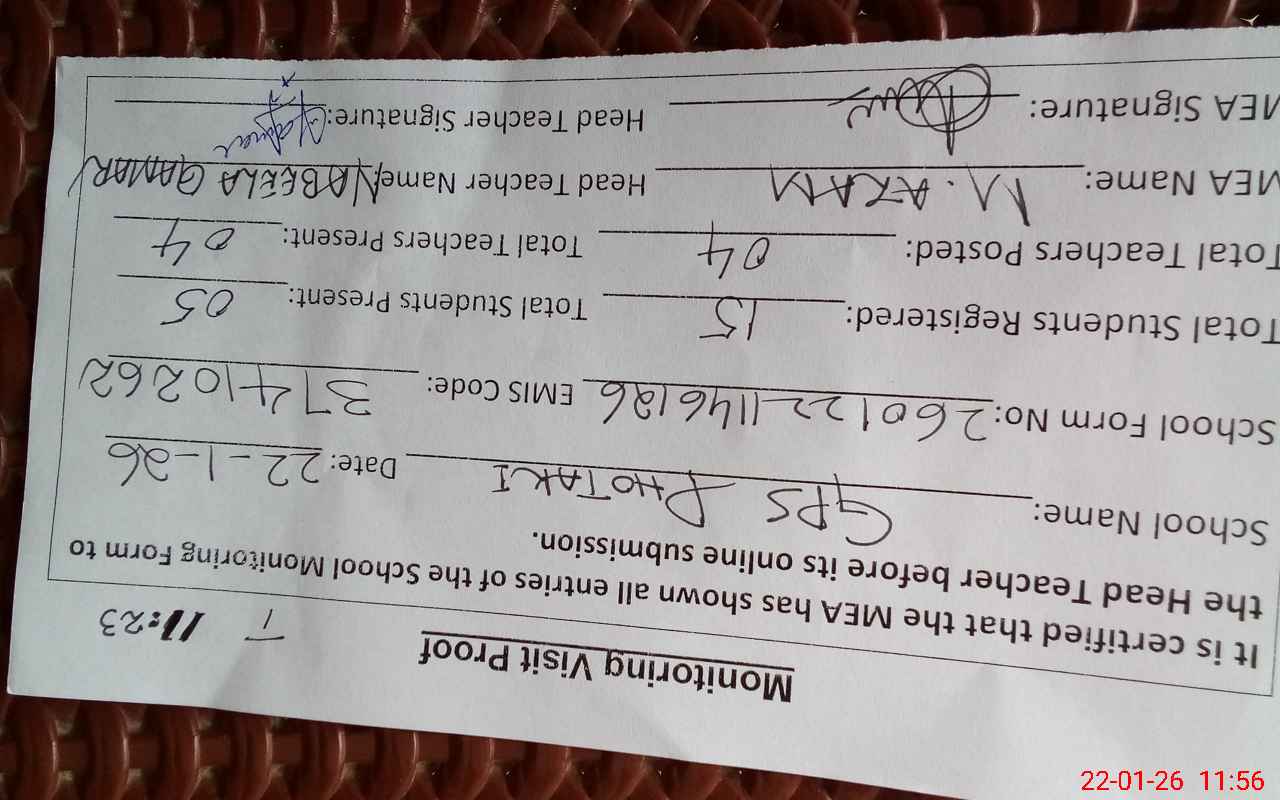 | Attendance Register | Head Teacher | MEA with School | Visit Proof |