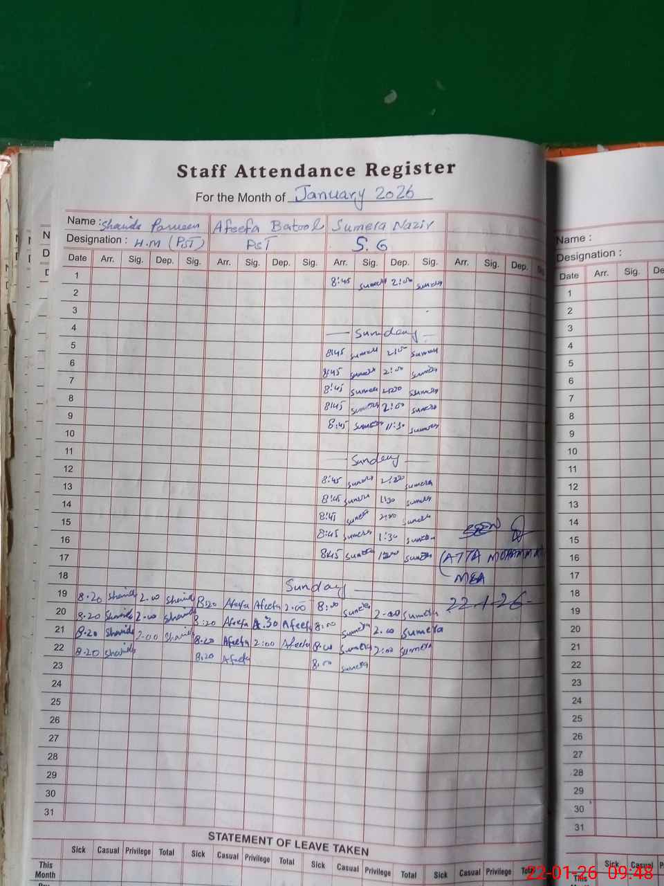 | Leave | Duty | Absent | Maternity | Medical | Ex- Pak |