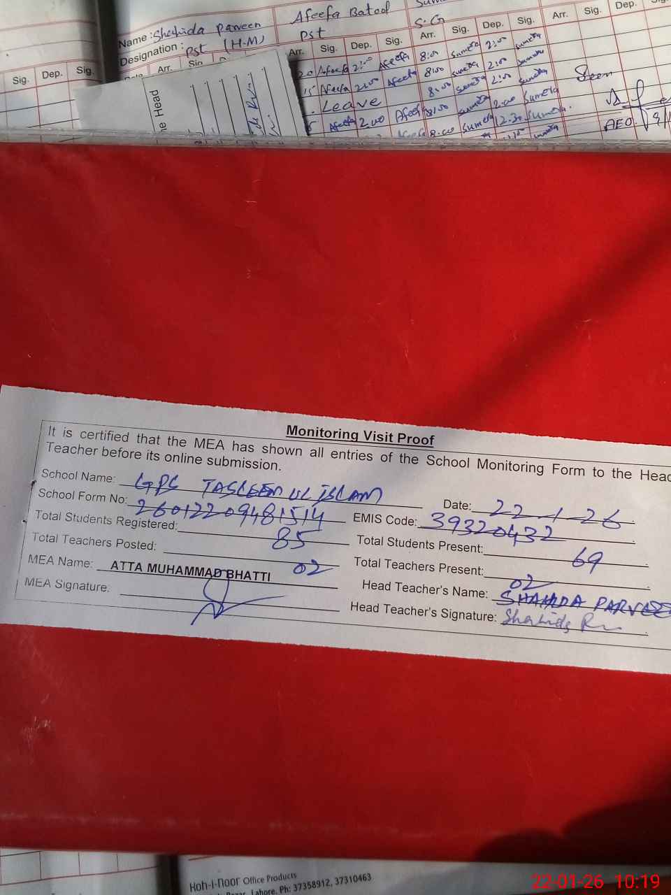 | Attendance Register | Head Teacher | MEA with School | Visit Proof |