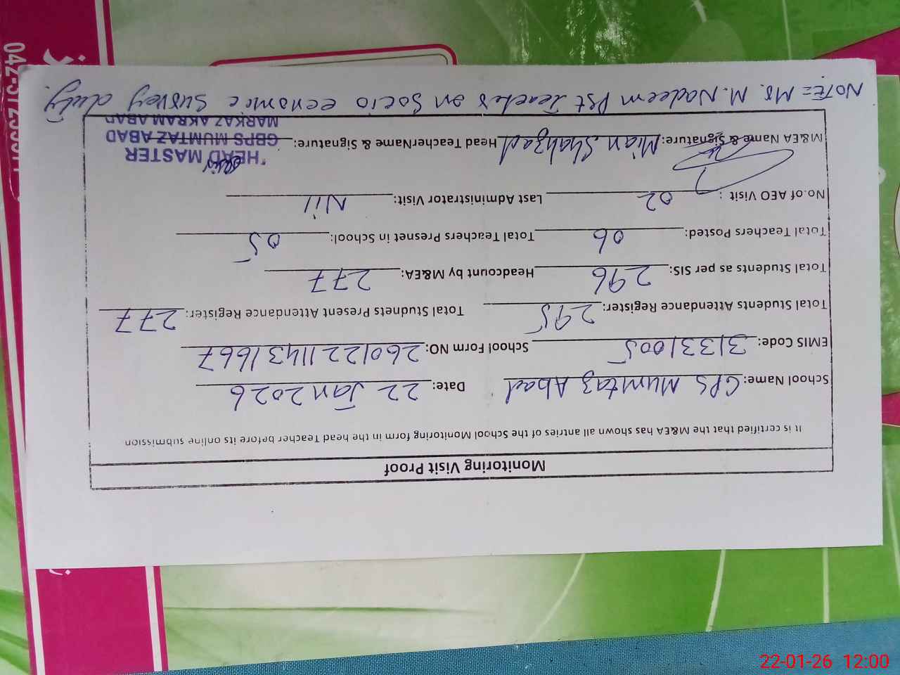 | Remarks (Use Separate Page if Required): Mr Muhammad Nadeem PST teacher on socio economic survey duty | |||||