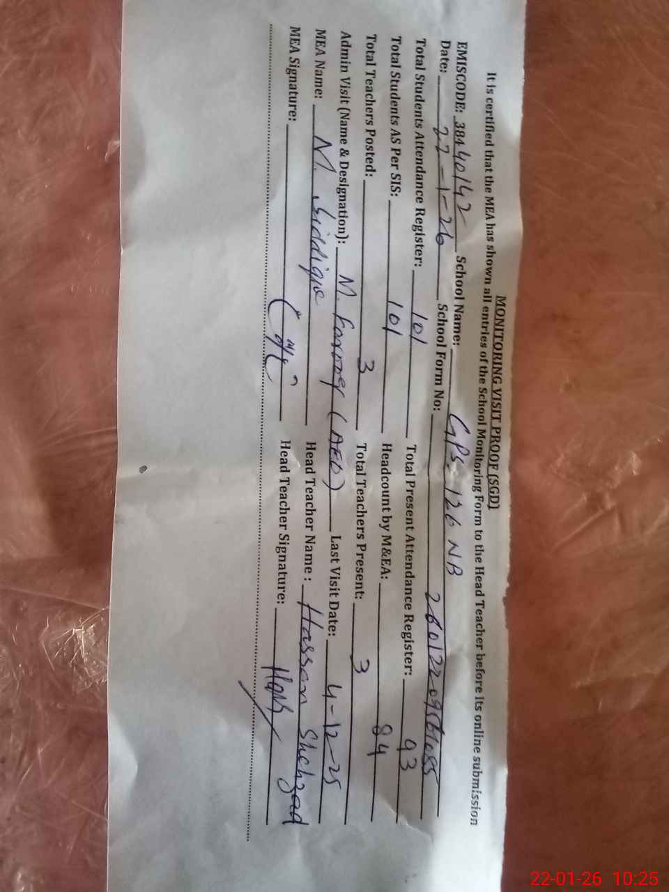 | Attendance Register | Head Teacher | MEA with School | Visit Proof |