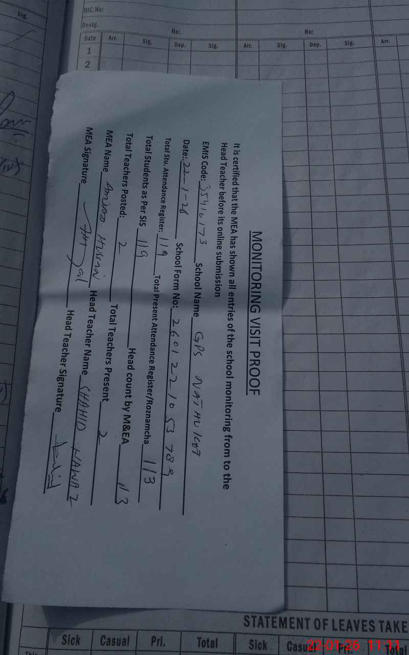 | Attendance Register | Head Teacher | MEA with School | Visit Proof |