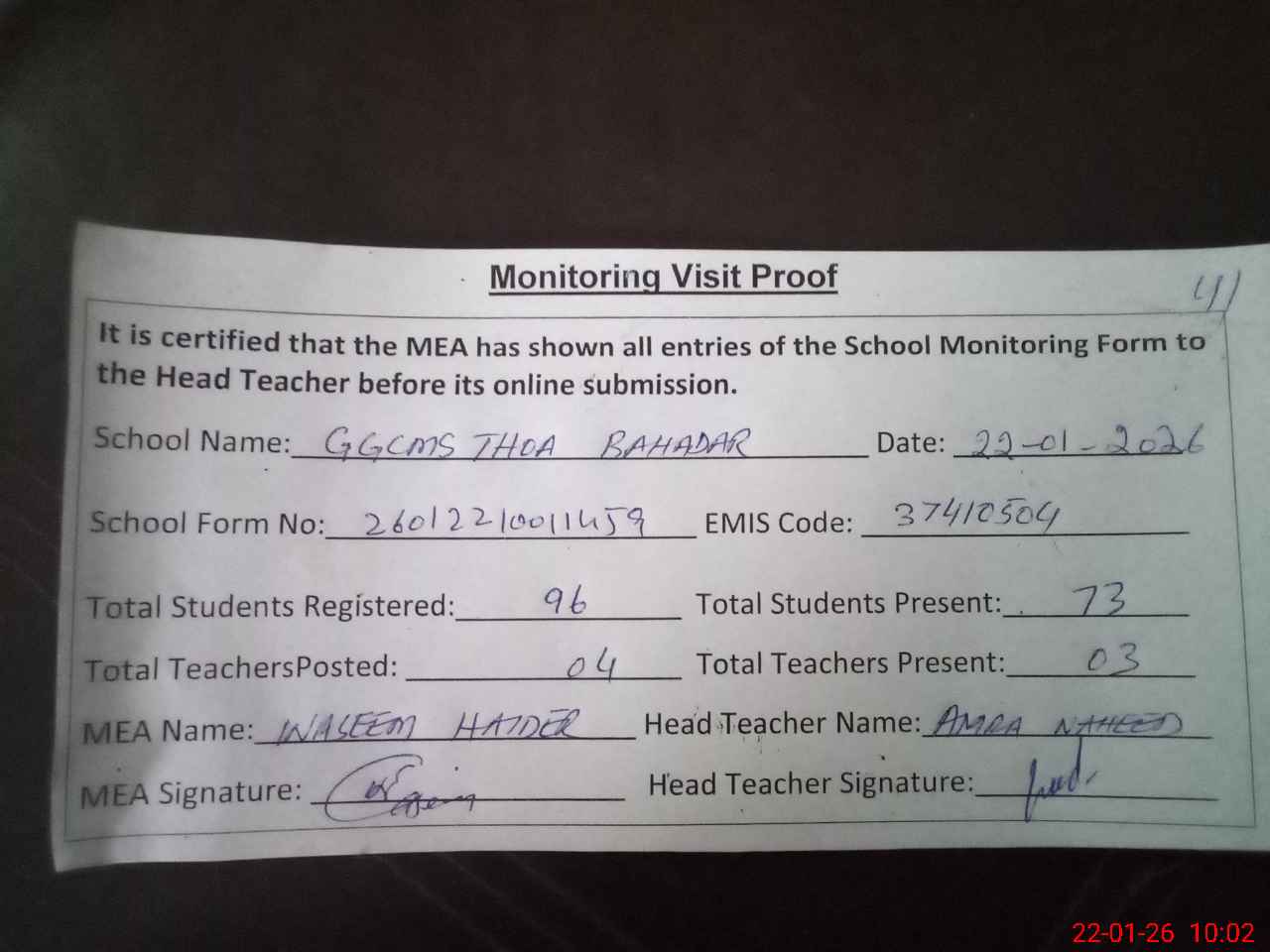 | Attendance Register | Head Teacher | MEA with School | Visit Proof |
