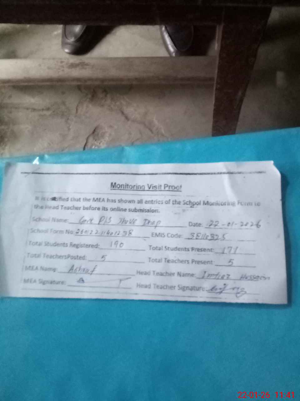 | Attendance Register | Head Teacher | MEA with School | Visit Proof |