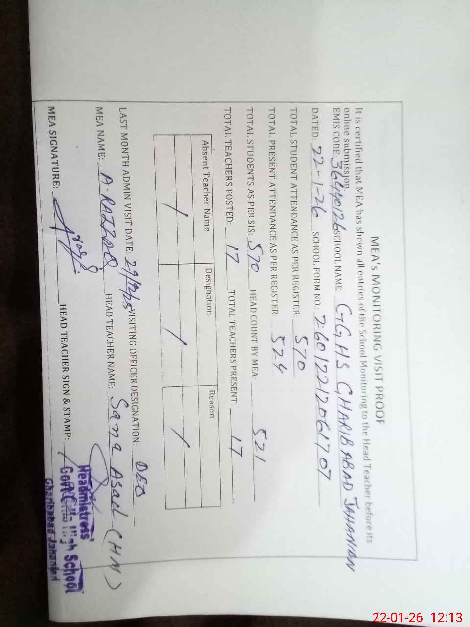 | Attendance Register | Head Teacher | MEA with School | Visit Proof |