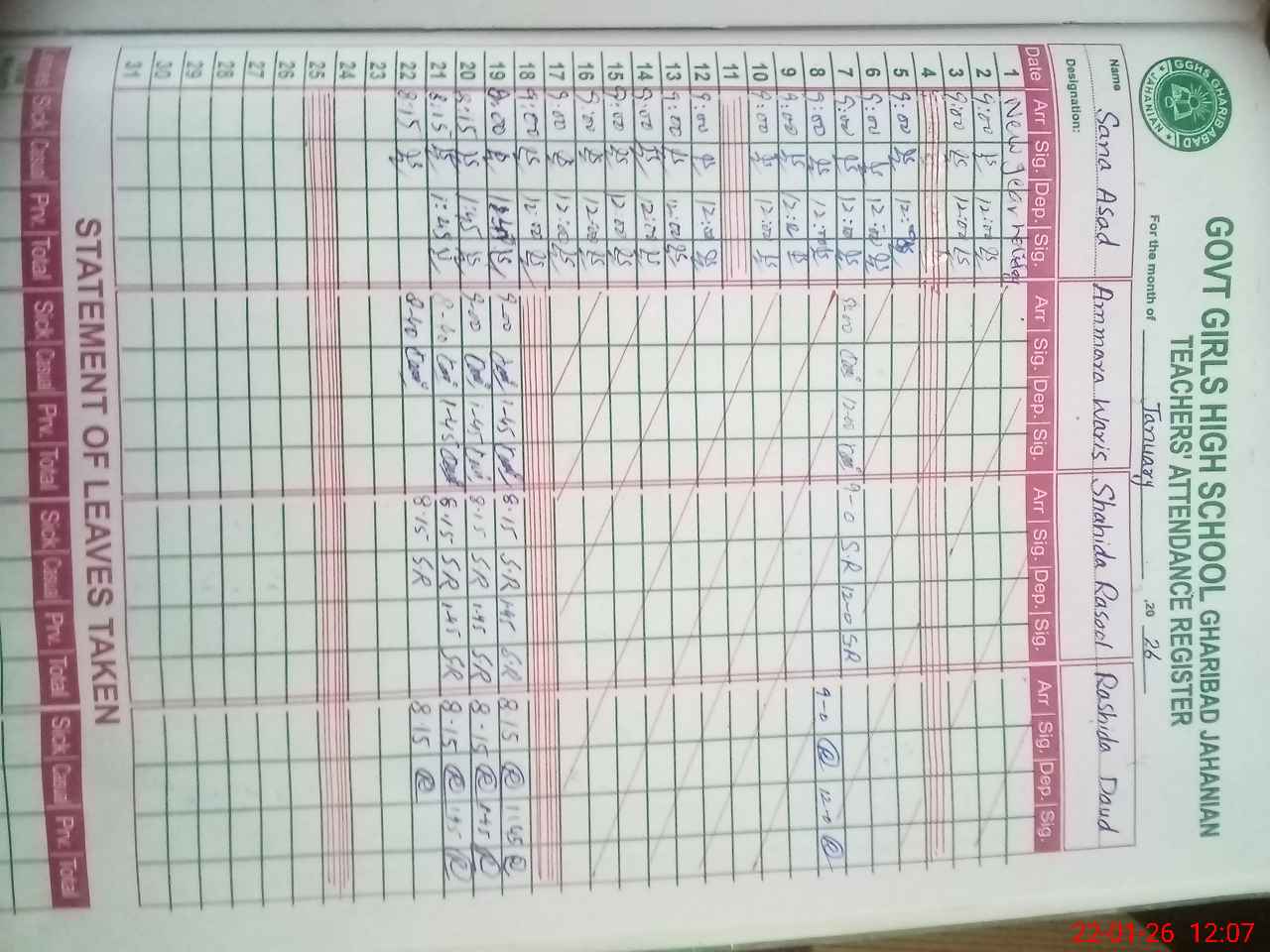 | CNIC | Full Name | Designation | R/C | Absence During Last Calender Month |