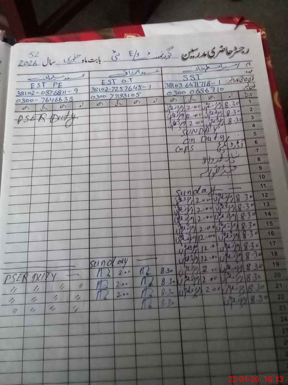 | CNIC | Full Name | Designation | R/C | Absence during last cal. month |