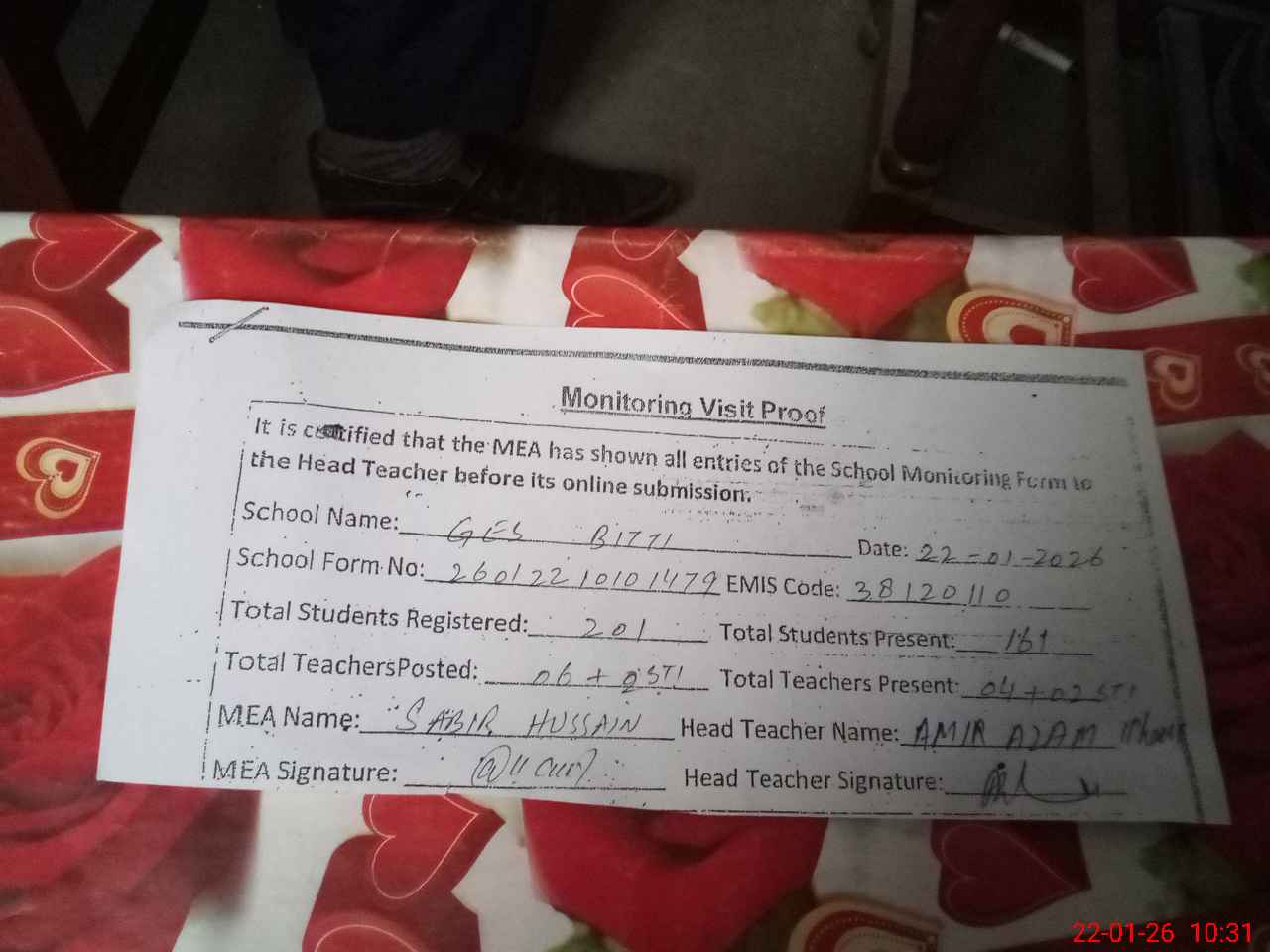 | Attendance Register | Head Teacher | MEA with School | Visit Proof |