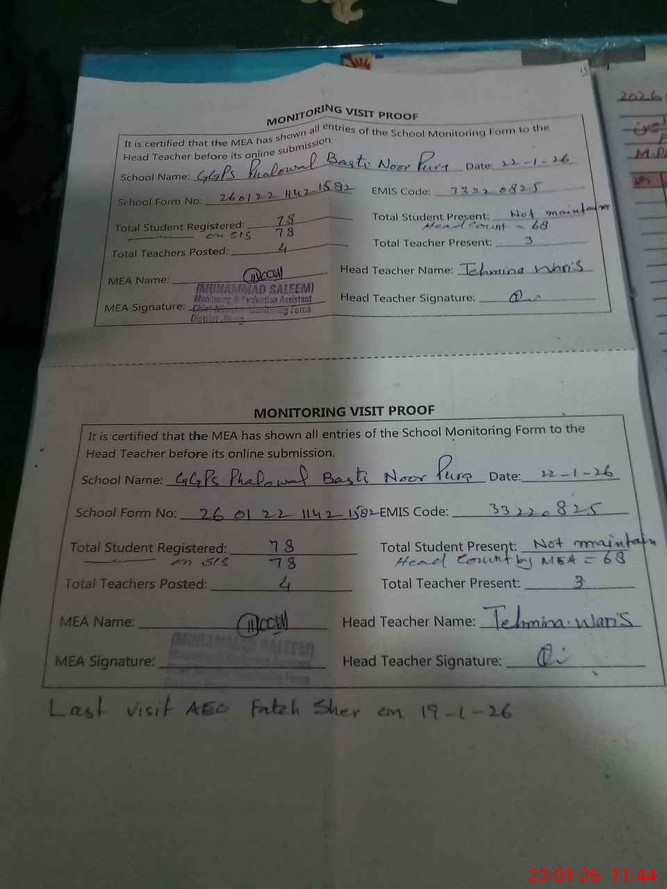 | Attendance Register | Head Teacher | MEA with School | Visit Proof |