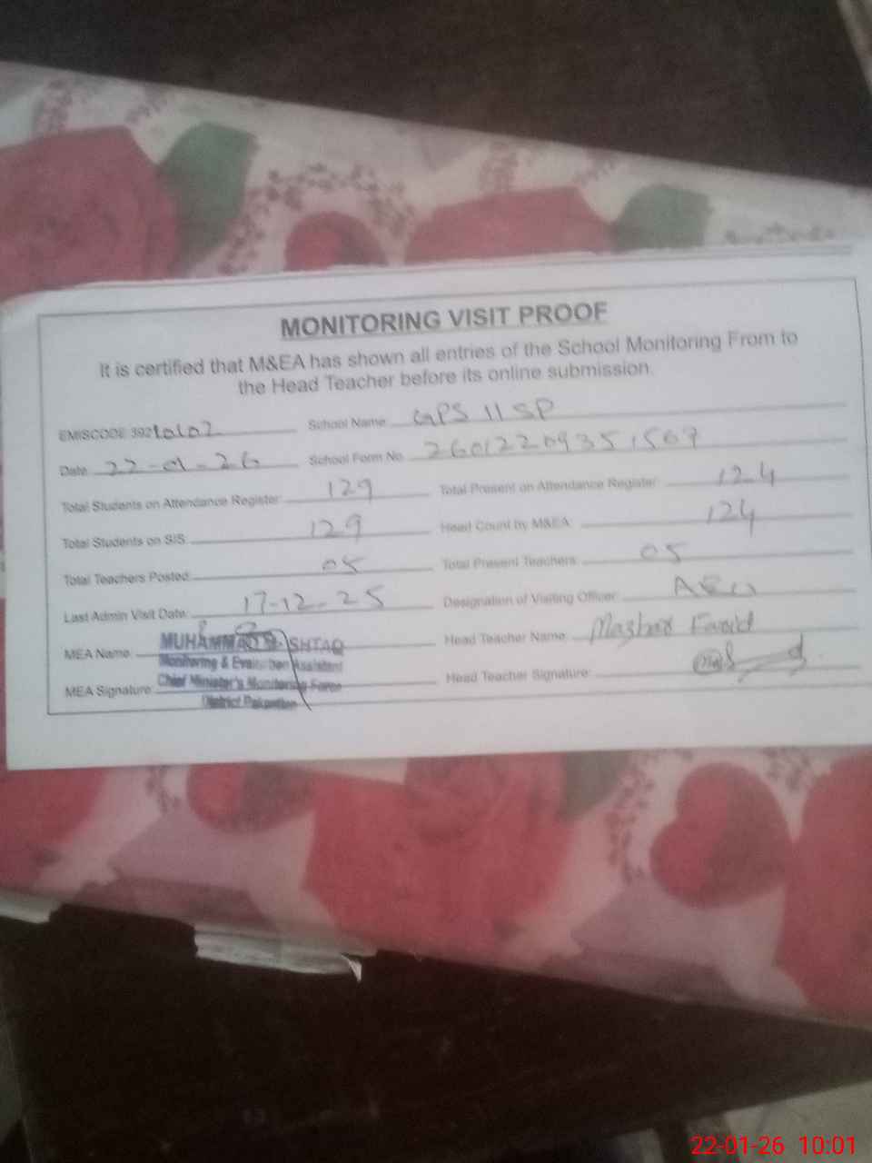 | EMIS Code: 39210102 | Name of School: GPS 11/SP P.O 8/S.P PAKPATTAN | |||