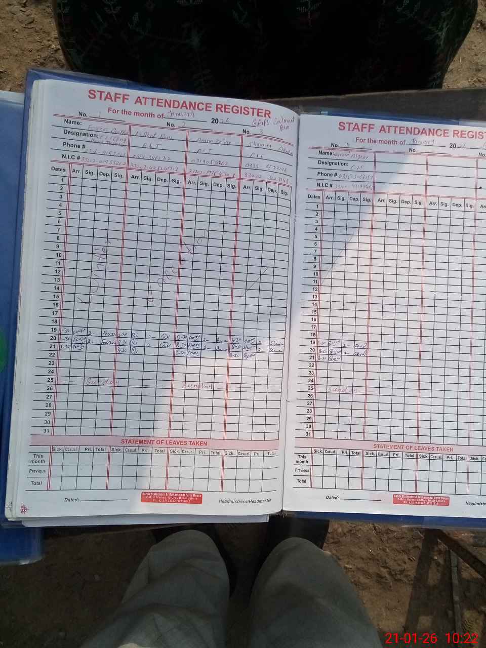 | CNIC | Full Name | Designation | R/C | Absence During Last Calender Month |