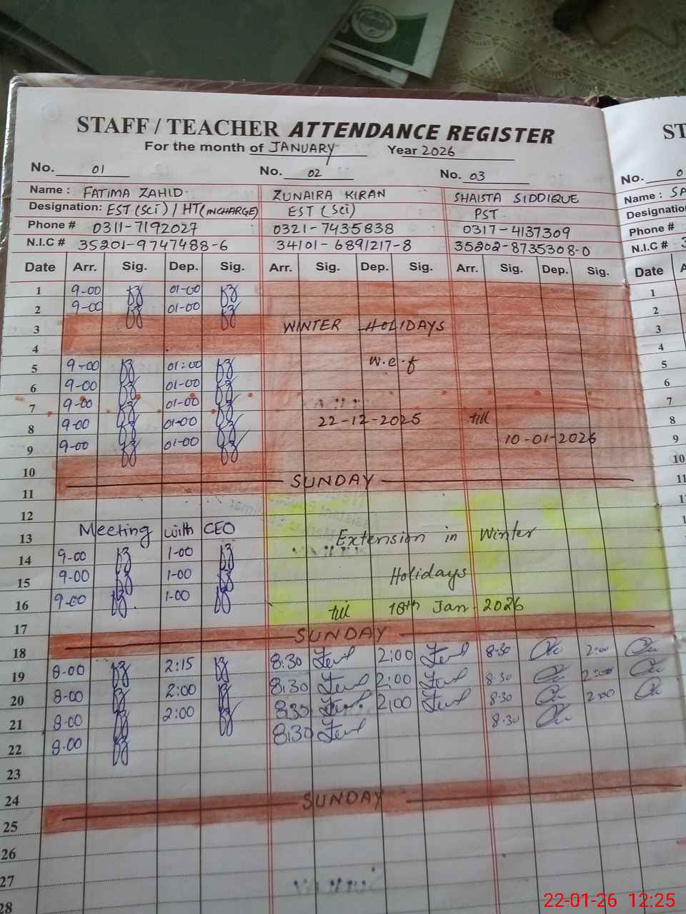 | CNIC | Full Name | Designation | R/C | Absence during last cal. month |